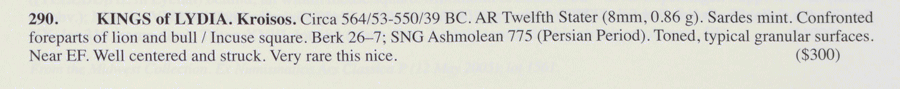References: Berk, The Coinage of Croesus in 100 Greatest Ancient Coins, 26-27.