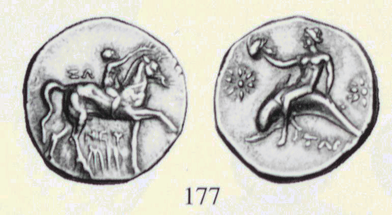 Nude youth riding r., crowning horse with wreath held in r. hand, and holding rein in l.; ZΩ to l., NEY/MH below / Phalanthos, holding helmet inr. hand, legs crossed, riding dolphin l.; stars flanking, [ΠΟΛΥ to upper r.], TAPAΣ below.