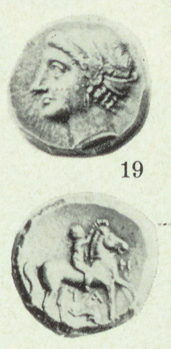 Head of the nymph Satyra, wearing an ampyx and earring, facing l. / Ephebe riding right, crowning his horse with his r. hand; above, a crescent moon; below, a dolphin and the monogram TA.