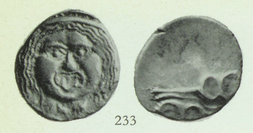 Gorgonian with open mouth and protruding tongue, below XX. / Two Kerykeia twisted against each other