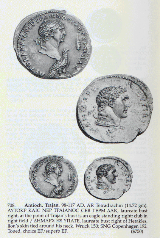Trajan was a Spanish born emperor of Rome. He is remembered for expanding the Roman empire to its largest under his reign. This particular coin was struck in Antioch. Trajan is displayed on the obverse and reverse shows a bust of Melqart, the Herakles of the region.