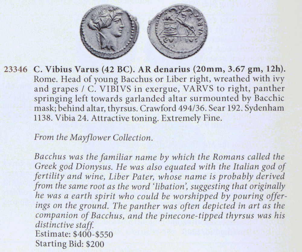 Head of Liber right, wearing ivy-wreath / Panther left springing up toward garlanded altar on which rests mask and against which rests thyrsus; in exergue, C.VIBIVS; on right VARVS
